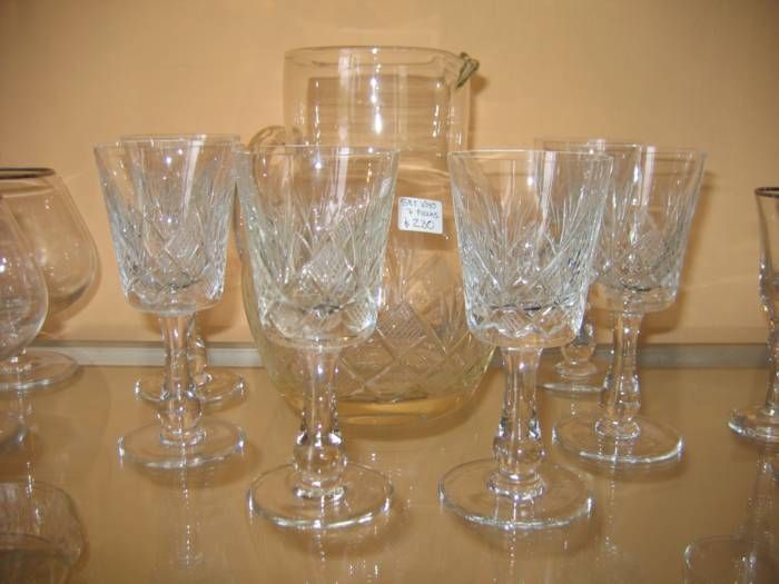 Set de 7 piezas, jarra y 6 copas, cristal tallado a mano.