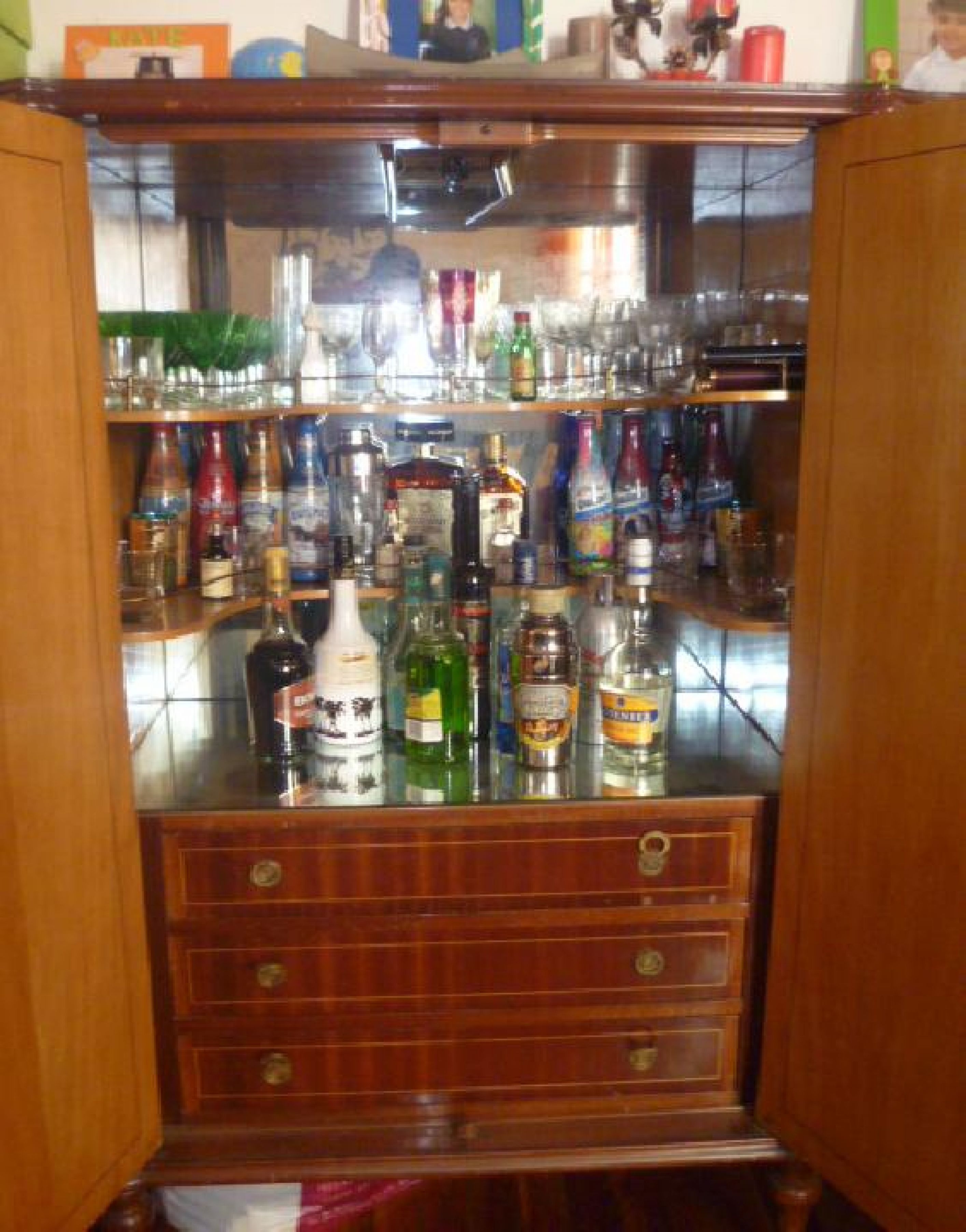 Bajillero con bar iluminado, cajones todos forrados , espejo, tiene 2 puertas con estantes para distintos usos.