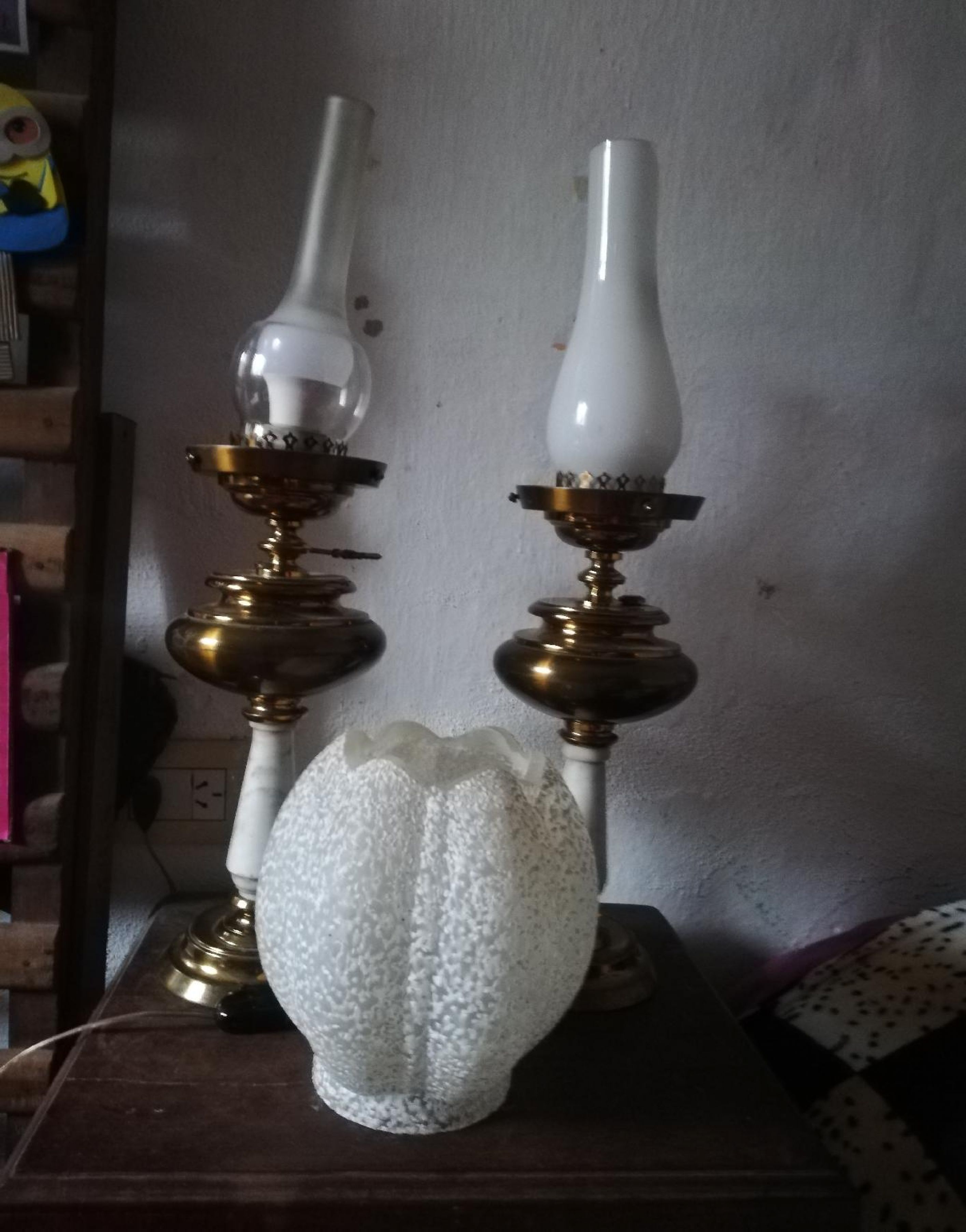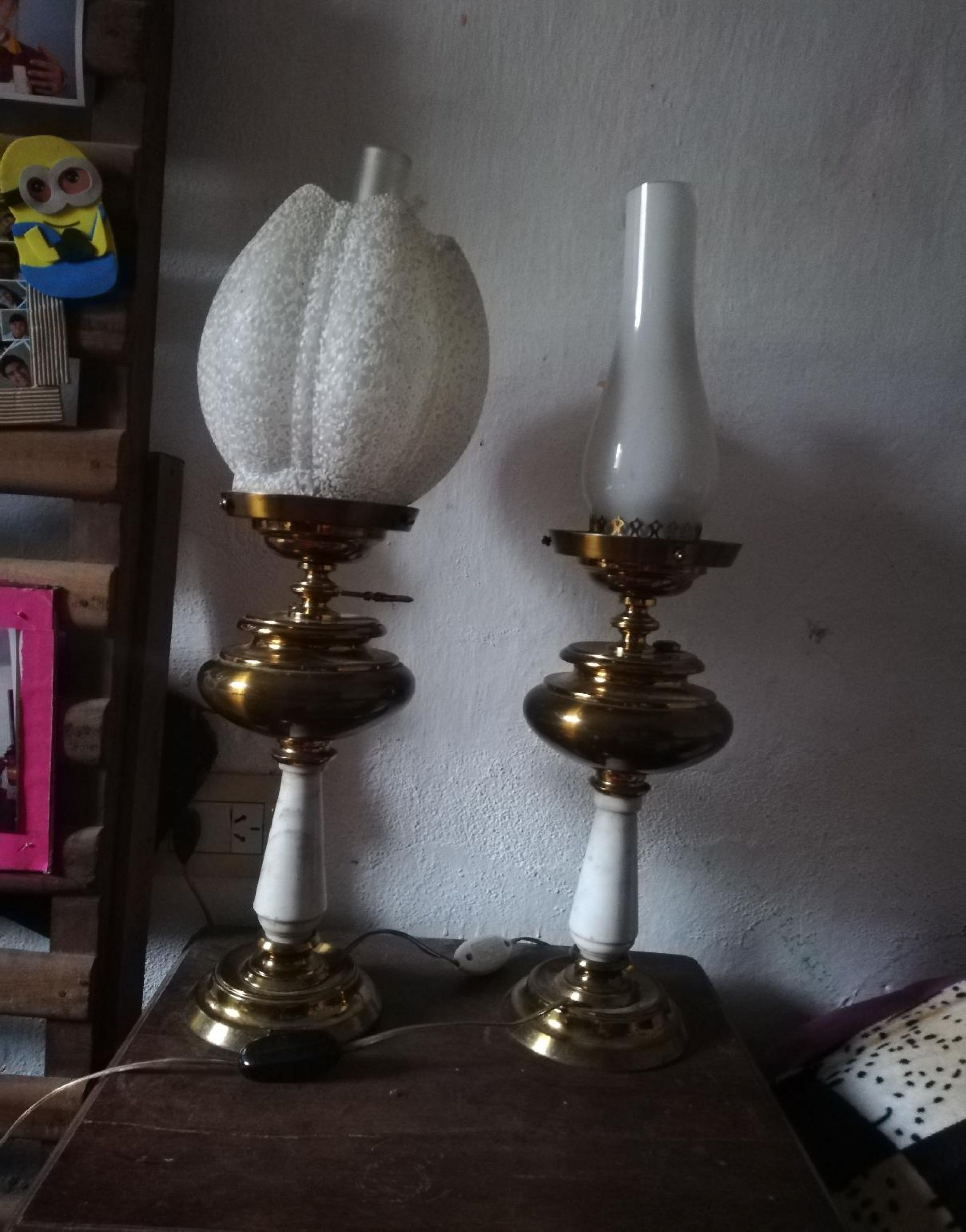 Juego de 2 veladores antiguos de bronce y mármol, tulipas incluí das.