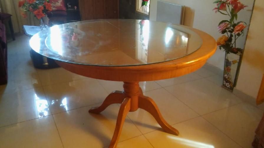 Mesa de cedro maciza, 1,20 m de diámetro, IMPECABLE, extensible a 1,20X1,50m. Con vidrio de 10mm de espesor