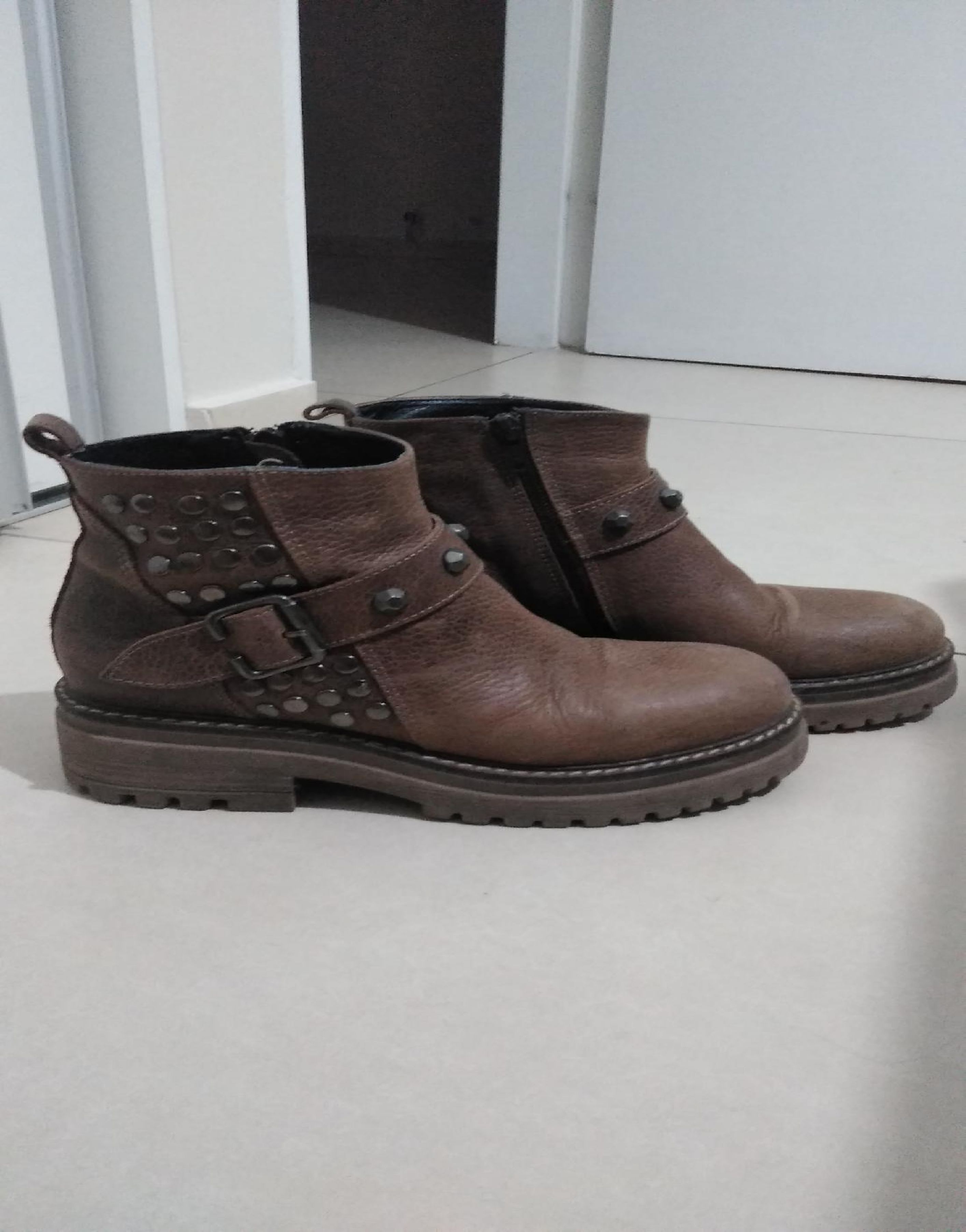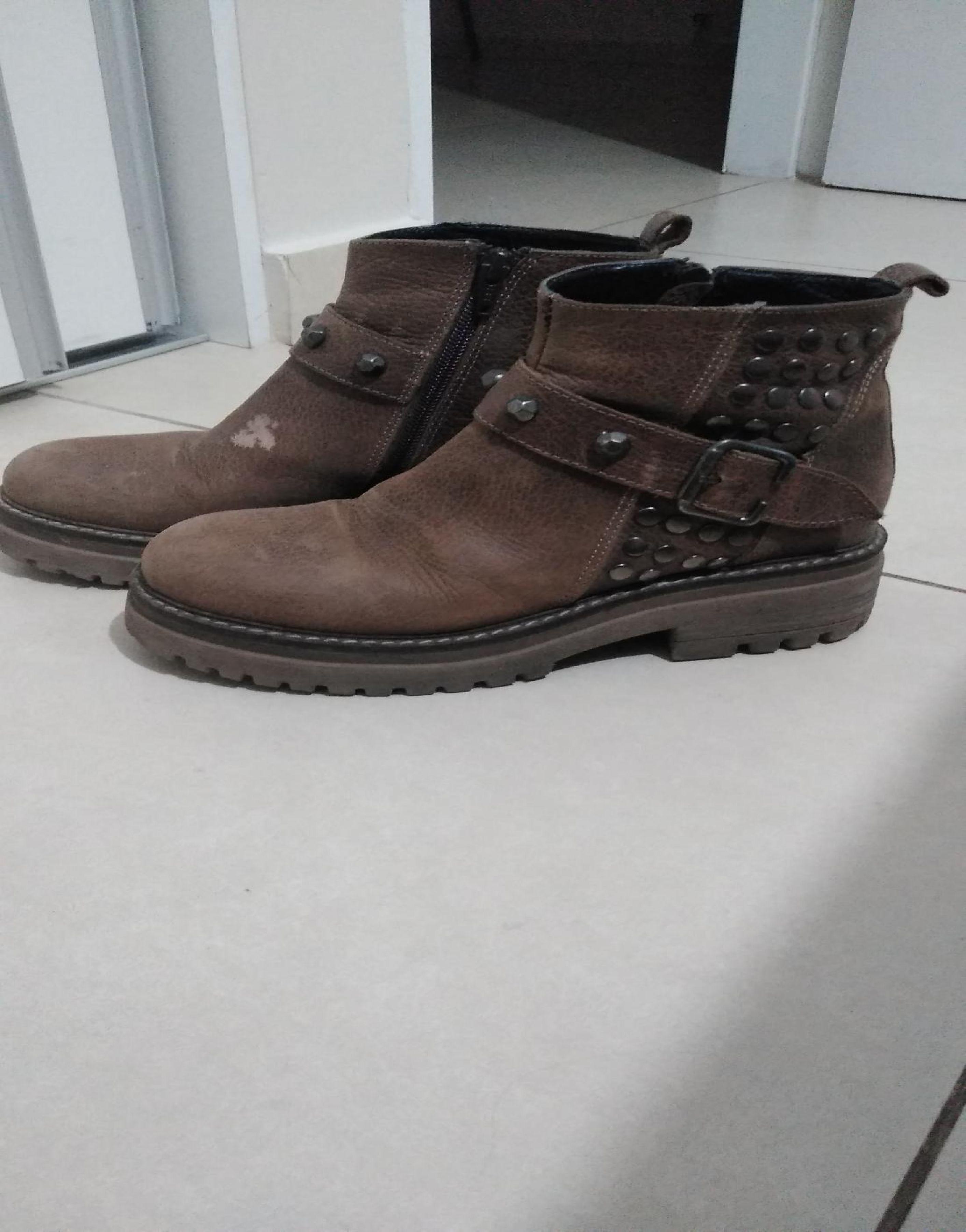 Con poco uso , color marrones con tachas cierres en los costados , tienen una pequeña mancha . Talle 36