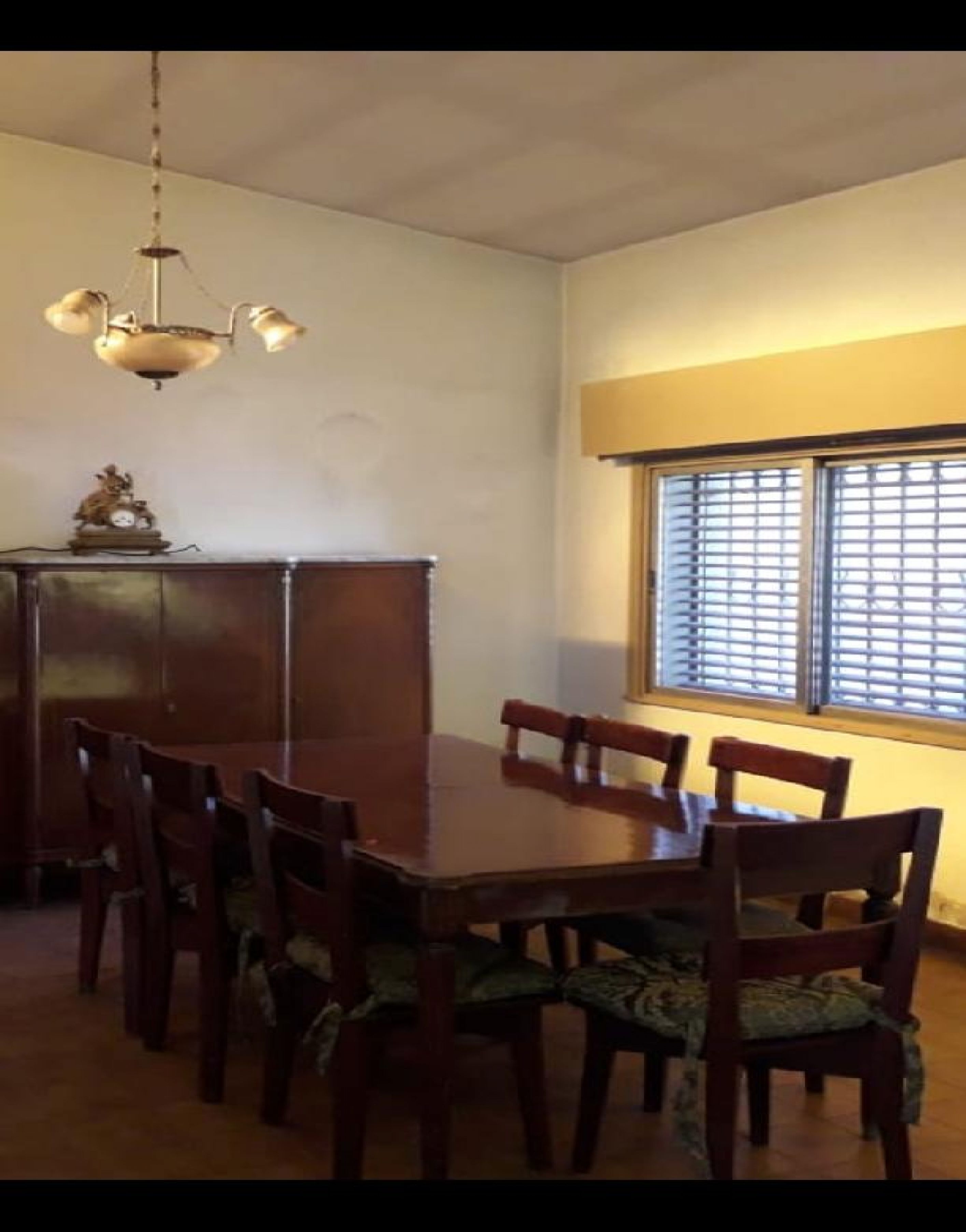 Es una mesa antigua con detalles de MARQUETERÍA a mano cubierta con vidrio y 6 sillas de algarrobo con almohadones..