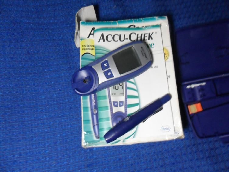 Medidor de glucosa Accu-chek Active de Roche, seis años de uso, perfectas condiciones, gasta poca pila, viene en estuche de plástico duro muy útil y práctico, viene con lanzetas.